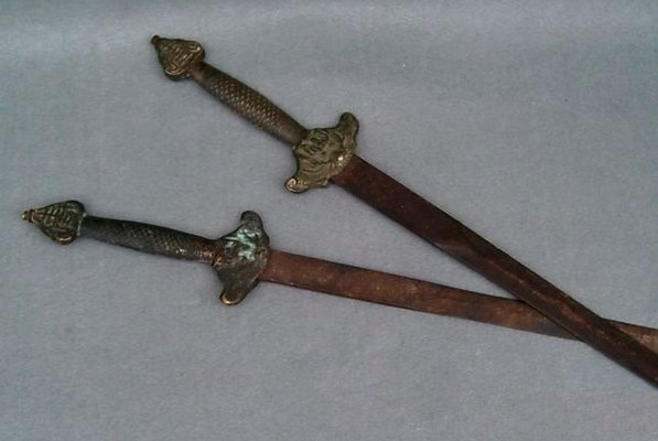 한쪽 면이 납작해 두 자루의 검이 한 칼집에 포개져 들어가는 이 쌍고검은 두자루의 쌍검으로 자웅일대검이라는 표현을 쓰곤하는데 일본에서 사용하는 명칭으로 보아 일본의 영향이 있었을 것 입니다. 실제로 드라마나 만화에서 유비가 이 쌍고검을 활용하는 장면이 많이 없는데 여포가 관우, 장비와 맞붙을때 유비가 쌍고검을 들고 달려와 싸운 것이 거의 유일합니다.